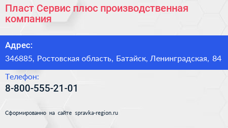 Пласт-Сервис плюс, производственная компания по адресу 346885, Ростовская область, Батайск, Ленинградская, 84 в дальнейшем Организация, размещена в следующих категориях: