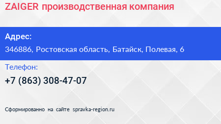 ZAIGER, производственная компания по адресу 346886, Ростовская область, Батайск, Полевая, 6 в дальнейшем Организация, размещена в следующих категориях: