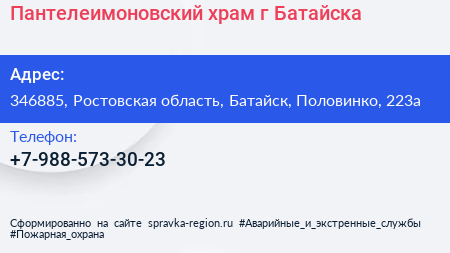 Пантелеимоновский храм г. Батайска по адресу 346885, Ростовская область, Батайск, Половинко, 223а в дальнейшем Организация, размещена в следующих категориях: