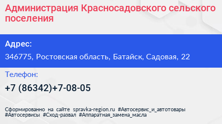 Администрация Красносадовского сельского поселения по адресу 346775, Ростовская область, Батайск, Садовая, 22 в дальнейшем Организация, размещена в следующих категориях: