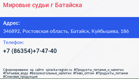 Мировые судьи г. Батайска по адресу 346892, Ростовская область, Батайск, Куйбышева, 186 в дальнейшем Организация, размещена в следующих категориях: