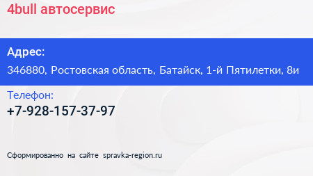 4bull, автосервис по адресу 346880, Ростовская область, Батайск, 1-й Пятилетки, 8и в дальнейшем Организация, размещена в следующих категориях:
