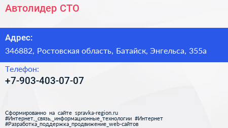 Автолидер, СТО по адресу 346882, Ростовская область, Батайск, Энгельса, 355а в дальнейшем Организация, размещена в следующих категориях: