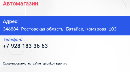 Автомагазин по адресу 346884, Ростовская область, Батайск, Комарова, 103 в дальнейшем Организация, размещена в следующих категориях: