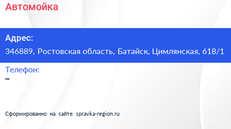 Автомойка по адресу 346889, Ростовская область, Батайск, Цимлянская, 618/1 в дальнейшем Организация, размещена в следующих категориях: