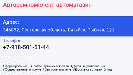 Авторемкомплект, автомагазин по адресу 346892, Ростовская область, Батайск, Рыбная, 121 в дальнейшем Организация, размещена в следующих категориях: