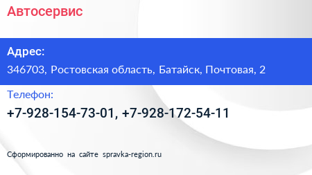 Автосервис по адресу 346703, Ростовская область, Батайск, Почтовая, 2 в дальнейшем Организация, размещена в следующих категориях: