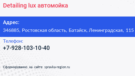 Detailing lux, автомойка по адресу 346885, Ростовская область, Батайск, Ленинградская, 115 в дальнейшем Организация, размещена в следующих категориях: