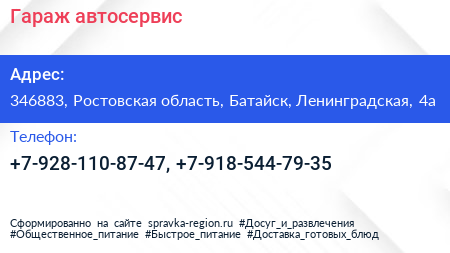 Гараж, автосервис по адресу 346883, Ростовская область, Батайск, Ленинградская, 4а в дальнейшем Организация, размещена в следующих категориях: