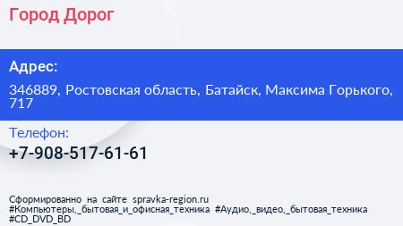 Город Дорог по адресу 346889, Ростовская область, Батайск, Максима Горького, 717 в дальнейшем Организация, размещена в следующих категориях: