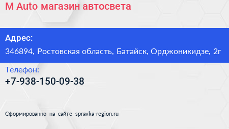 M-Auto, магазин автосвета по адресу 346894, Ростовская область, Батайск, Орджоникидзе, 2г в дальнейшем Организация, размещена в следующих категориях: