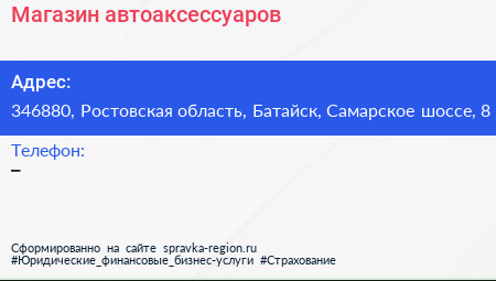 Магазин автоаксессуаров по адресу 346880, Ростовская область, Батайск, Самарское шоссе, 8 в дальнейшем Организация, размещена в следующих категориях:
