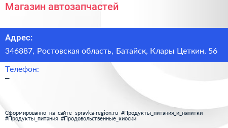 Магазин автозапчастей по адресу 346887, Ростовская область, Батайск, Клары Цеткин, 56 в дальнейшем Организация, размещена в следующих категориях: