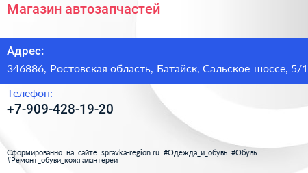 Магазин автозапчастей по адресу 346886, Ростовская область, Батайск, Сальское шоссе, 5/1 в дальнейшем Организация, размещена в следующих категориях: