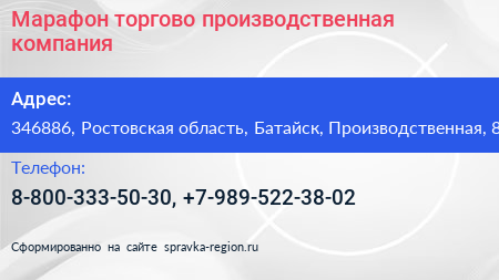 Марафон, торгово-производственная компания по адресу 346886, Ростовская область, Батайск, Производственная, 8 в дальнейшем Организация, размещена в следующих категориях: