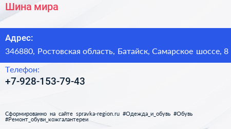 Шина мира по адресу 346880, Ростовская область, Батайск, Самарское шоссе, 8 в дальнейшем Организация, размещена в следующих категориях: