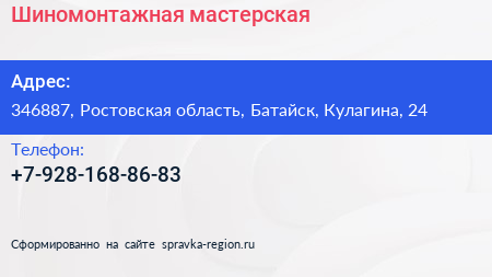 Шиномонтажная мастерская по адресу 346887, Ростовская область, Батайск, Кулагина, 24 в дальнейшем Организация, размещена в следующих категориях: