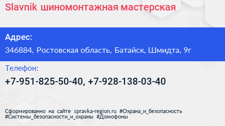 Slavnik, шиномонтажная мастерская по адресу 346884, Ростовская область, Батайск, Шмидта, 9г в дальнейшем Организация, размещена в следующих категориях: