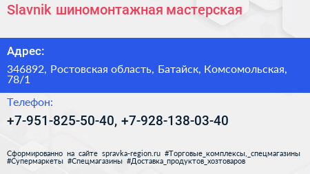 Slavnik, шиномонтажная мастерская по адресу 346892, Ростовская область, Батайск, Комсомольская, 78/1 в дальнейшем Организация, размещена в следующих категориях: