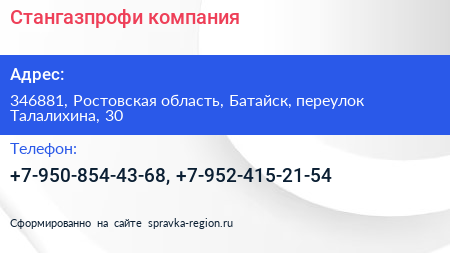 Стангазпрофи, компания по адресу 346881, Ростовская область, Батайск, переулок Талалихина, 30 в дальнейшем Организация, размещена в следующих категориях: