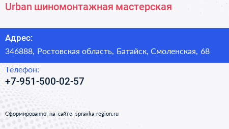 Urban, шиномонтажная мастерская по адресу 346888, Ростовская область, Батайск, Смоленская, 68 в дальнейшем Организация, размещена в следующих категориях: