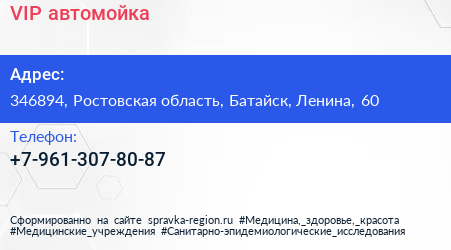 VIP, автомойка по адресу 346894, Ростовская область, Батайск, Ленина, 60 в дальнейшем Организация, размещена в следующих категориях: