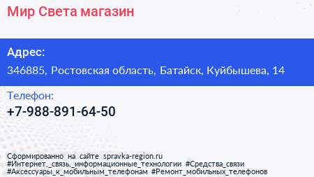 Мир Света, магазин по адресу 346885, Ростовская область, Батайск, Куйбышева, 14 в дальнейшем Организация, размещена в следующих категориях: