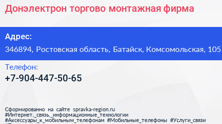 Донэлектрон, торгово-монтажная фирма по адресу 346894, Ростовская область, Батайск, Комсомольская, 105 в дальнейшем Организация, размещена в следующих категориях: