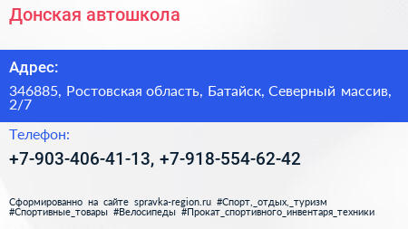 Донская автошкола по адресу 346885, Ростовская область, Батайск, Северный массив, 2/7 в дальнейшем Организация, размещена в следующих категориях: