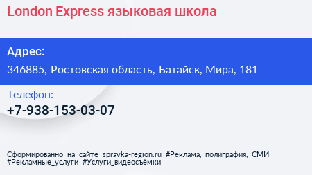 London Express, языковая школа по адресу 346885, Ростовская область, Батайск, Мира, 181 в дальнейшем Организация, размещена в следующих категориях: