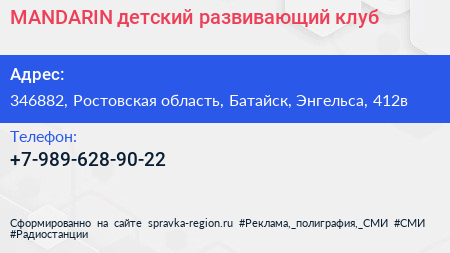 MANDARIN, детский развивающий клуб по адресу 346882, Ростовская область, Батайск, Энгельса, 412в в дальнейшем Организация, размещена в следующих категориях: