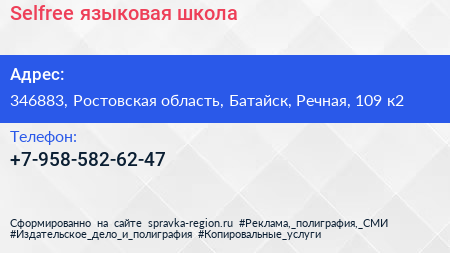 Selfree, языковая школа по адресу 346883, Ростовская область, Батайск, Речная, 109 к2 в дальнейшем Организация, размещена в следующих категориях: