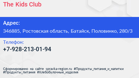 The Kids`Club по адресу 346885, Ростовская область, Батайск, Половинко, 280/3 в дальнейшем Организация, размещена в следующих категориях:
