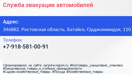 Служба эвакуации автомобилей по адресу 346882, Ростовская область, Батайск, Орджоникидзе, 110 в дальнейшем Организация, размещена в следующих категориях: