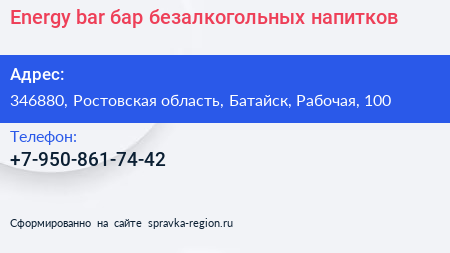 Energy bar, бар безалкогольных напитков по адресу 346880, Ростовская область, Батайск, Рабочая, 100 в дальнейшем Организация, размещена в следующих категориях: