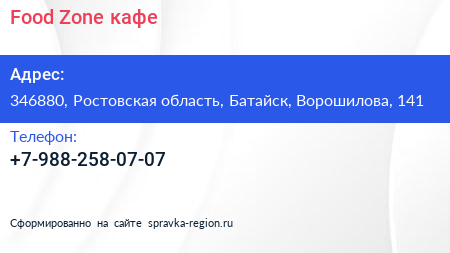 Food Zone, кафе по адресу 346880, Ростовская область, Батайск, Ворошилова, 141 в дальнейшем Организация, размещена в следующих категориях: