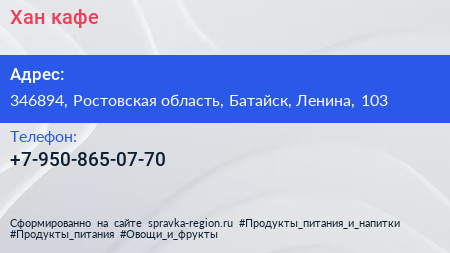 Хан, кафе по адресу 346894, Ростовская область, Батайск, Ленина, 103 в дальнейшем Организация, размещена в следующих категориях: