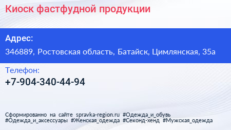 Киоск фастфудной продукции по адресу 346889, Ростовская область, Батайск, Цимлянская, 35а в дальнейшем Организация, размещена в следующих категориях: