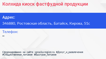 Колхида, киоск фастфудной продукции по адресу 346880, Ростовская область, Батайск, Кирова, 51с в дальнейшем Организация, размещена в следующих категориях: