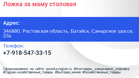 Ложка за маму, столовая по адресу 346880, Ростовская область, Батайск, Самарское шоссе, 23а в дальнейшем Организация, размещена в следующих категориях: