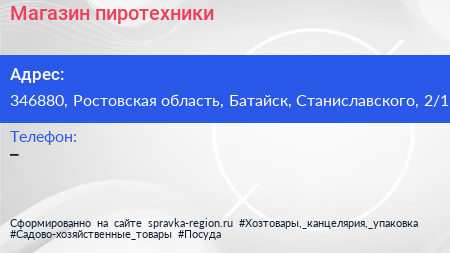 Магазин пиротехники по адресу 346880, Ростовская область, Батайск, Станиславского, 2/1 в дальнейшем Организация, размещена в следующих категориях: