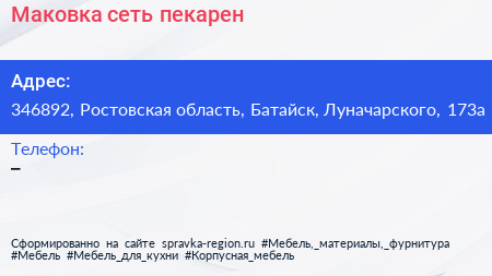 Маковка, сеть пекарен по адресу 346892, Ростовская область, Батайск, Луначарского, 173а в дальнейшем Организация, размещена в следующих категориях: