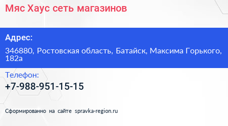 Мяс Хаус, сеть магазинов по адресу 346880, Ростовская область, Батайск, Максима Горького, 182а в дальнейшем Организация, размещена в следующих категориях: