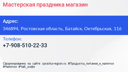 Мастерская праздника, магазин по адресу 346894, Ростовская область, Батайск, Октябрьская, 116 в дальнейшем Организация, размещена в следующих категориях: