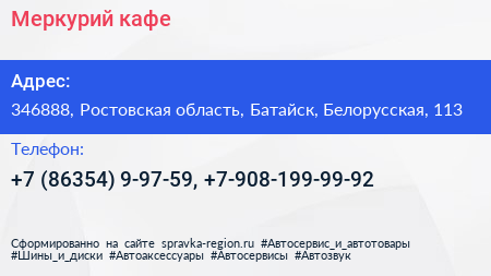 Меркурий, кафе по адресу 346888, Ростовская область, Батайск, Белорусская, 113 в дальнейшем Организация, размещена в следующих категориях: