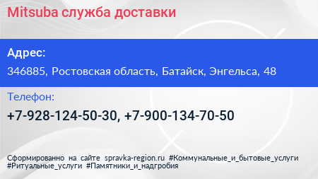 Mitsuba, служба доставки по адресу 346885, Ростовская область, Батайск, Энгельса, 48 в дальнейшем Организация, размещена в следующих категориях: