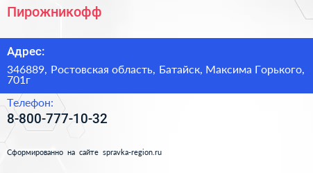 Пирожникофф по адресу 346889, Ростовская область, Батайск, Максима Горького, 701г в дальнейшем Организация, размещена в следующих категориях: