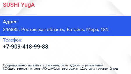 SUSHI YugA по адресу 346885, Ростовская область, Батайск, Мира, 181 в дальнейшем Организация, размещена в следующих категориях: