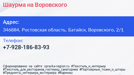 Шаурма на Воровского по адресу 346884, Ростовская область, Батайск, Воровского, 2/1 в дальнейшем Организация, размещена в следующих категориях:
