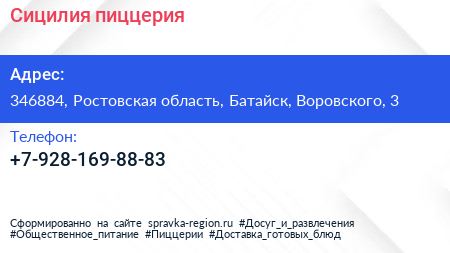 Сицилия, пиццерия по адресу 346884, Ростовская область, Батайск, Воровского, 3 в дальнейшем Организация, размещена в следующих категориях: